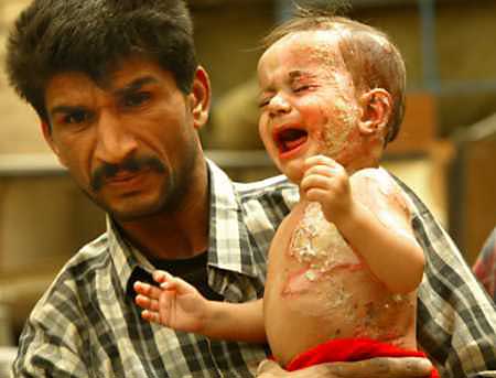 Kudeir, a 30 year-old Iraqi, carries his badly burned