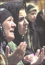 women pray in Baghdad after the US dropped bunker buster bombs. (AP